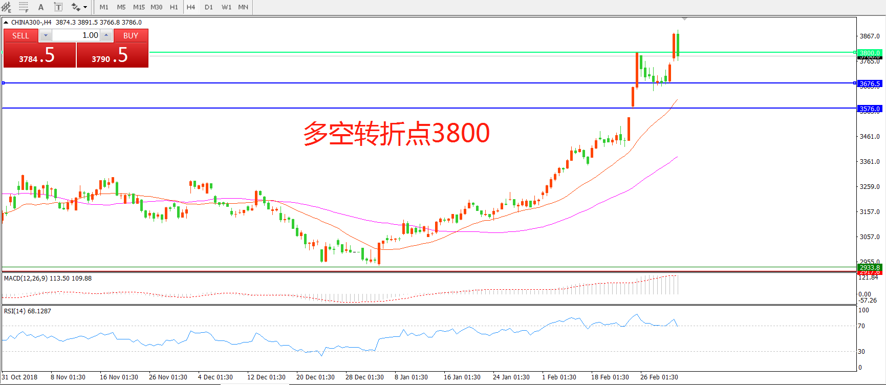 4小时图看,CHINA300中华指数触及上方3800一线出现回落,短期依然处于调整期,但均线系统呈多头排列, MACD红柱增加,整体思路逢低做多。