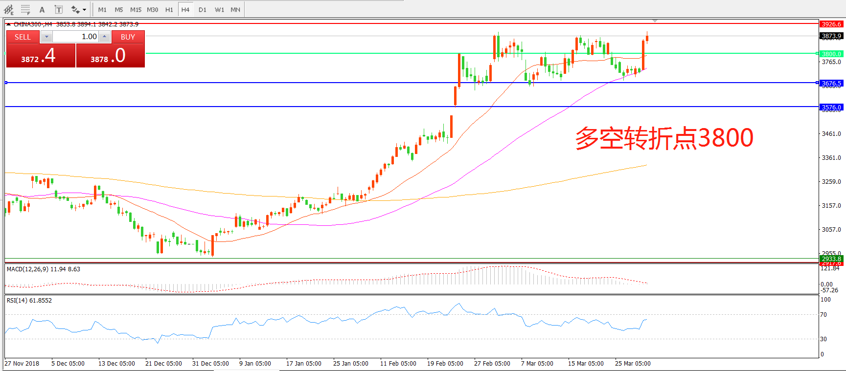 4小时图看,中华指数CHINA300经过短期盘整后以55均线为依托,强势上行,逼近前高, MACD红柱减少,RSI指标走平,小幅回调成为可能,中期走势依然偏多。