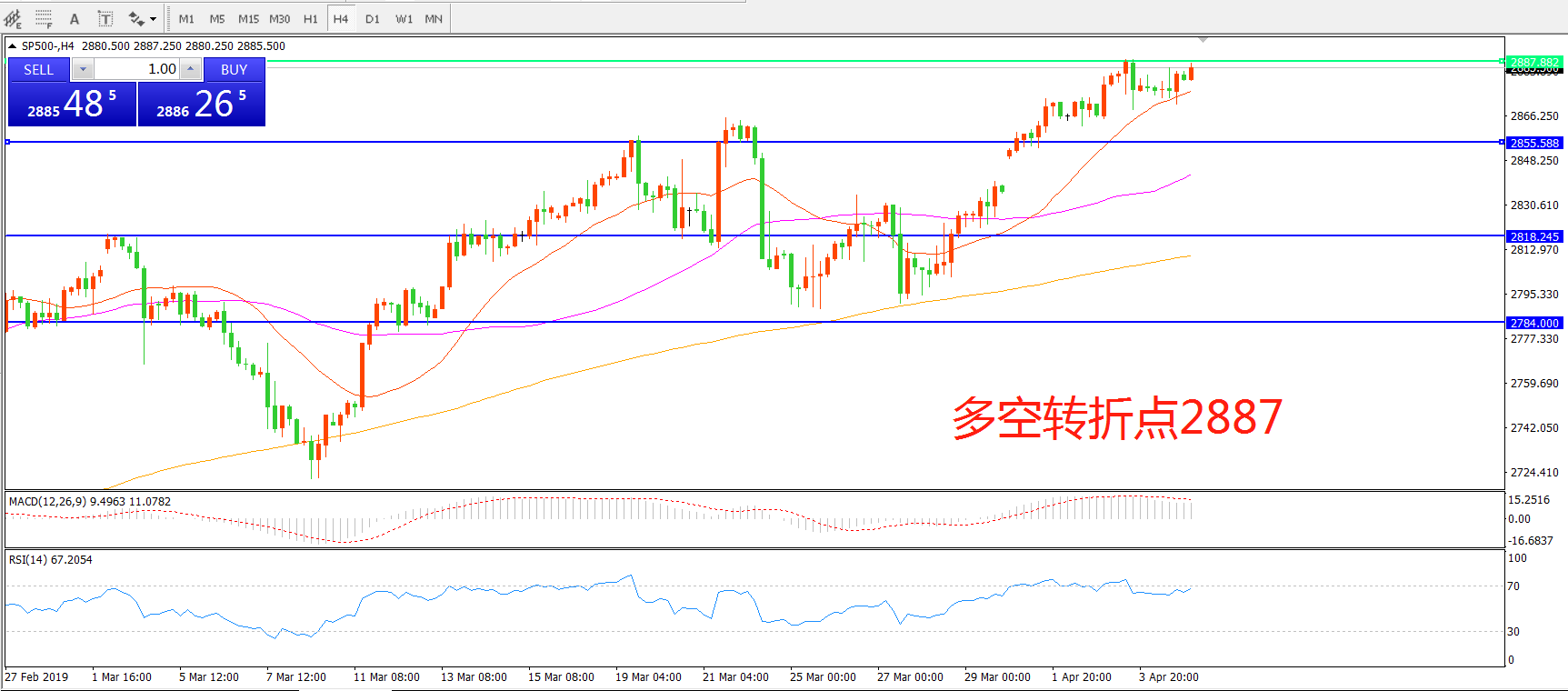 4小时图看,标普500突破2855后震荡上行,逐渐接近上方阻力2887,均线系统呈现多头排列, MACD红柱增加,RSI指标走平,日内走势震荡偏多。