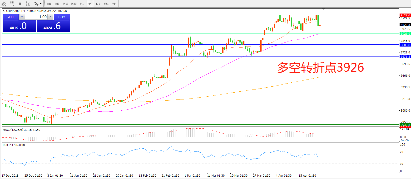 4小时图看,中华指数以21均线为支撑强势上升,第三次靠近上方阻力长阴下行,显示上方阻力较强,55均线与多空转折点共同形成支撑。MACD红柱减少,RSI指标拐头向上,日内依然以多头思路对待。