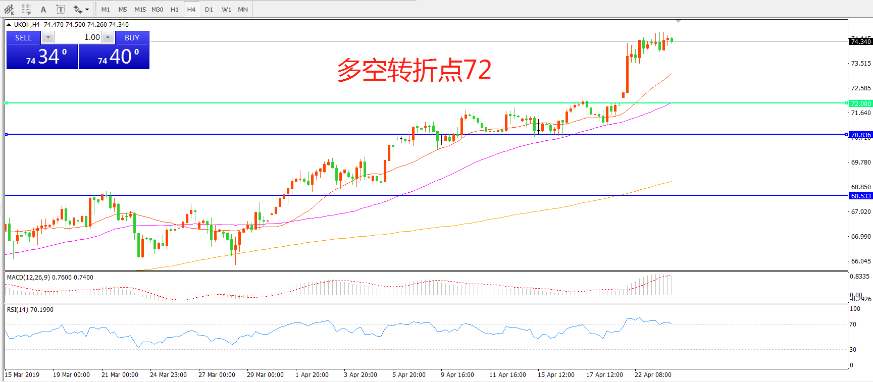4小时图看,油价突破前期阻力后震荡上升,短期走势偏强,均线系统呈现多头排列,MACD走平,RSI指标走平,日内仍以多头思路为主。