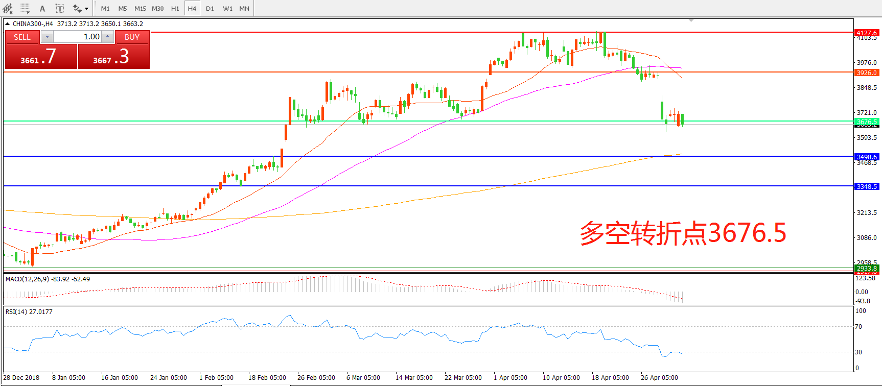 4小时图看,沪深300指数低开后小幅震荡,于3676.5附近反复争夺,短期走势依然偏空,21均线下穿形成死叉,MACD绿柱增加,RSI指标向下,日内以空头思路为主,切忌追多。