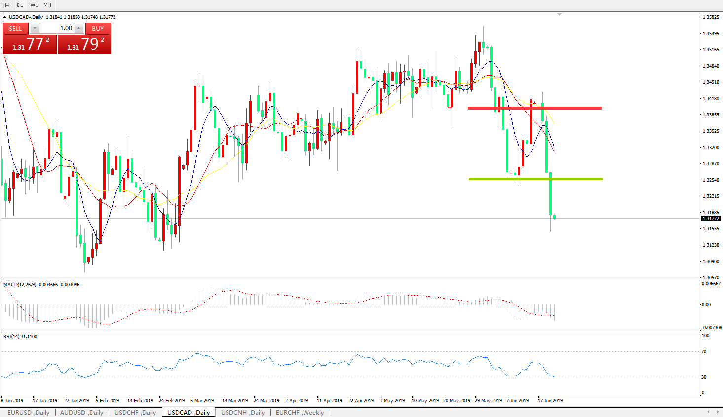 技术面简析:日线图均线开始再度下行,价格跌破前低后继续加速下行,MACD在0轴下方运行且动能柱再度放量,RSI继续走低,预计汇价将进一步下行。