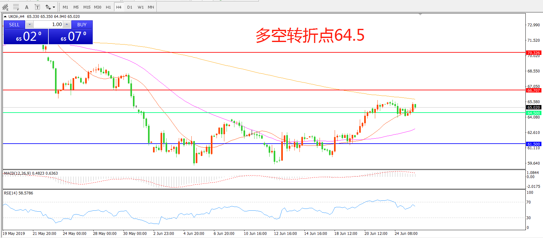 美国总统特朗普周二猛烈抨击伊朗,称伊朗对美国人的任何攻击都将遭遇“强大而压倒性的力量”和“毁灭”。特朗普在推特上发表这番评论的前一天,他宣布对该国实施新的制裁。而伊朗总统鲁哈尼对新的制裁措施做出回应,称这些制裁措施“令人发指、愚蠢至极”,并称白宫患有“精神疾病”。 周三凌晨API数据公布,截至6月21日当周,美国原油库存减少755万桶,为3月以来最大降幅,汽油库存也录得大幅下降,布油波动大,最终收报65.02美元/桶。晚间22:30将公布EIA库存数据,重点关注。