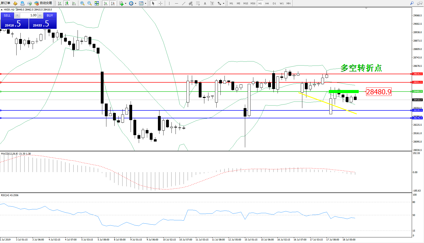 香港恒生指数7月18日(周四)收盘下跌131.51点,跌幅0.46%,报28461.66点;港股受累外围转差所影响,恒生指数持续受压。早间恒指低开200点后,再扩大跌幅,低见28376,最多跌216点。随后有见买盘支持而企稳,再收窄跌幅。唯有南向资金流入支持港股,连续流入8日,累计近70亿元。寄望能守稳28500。相信短期内仍维持在28000至29000之间波动。
