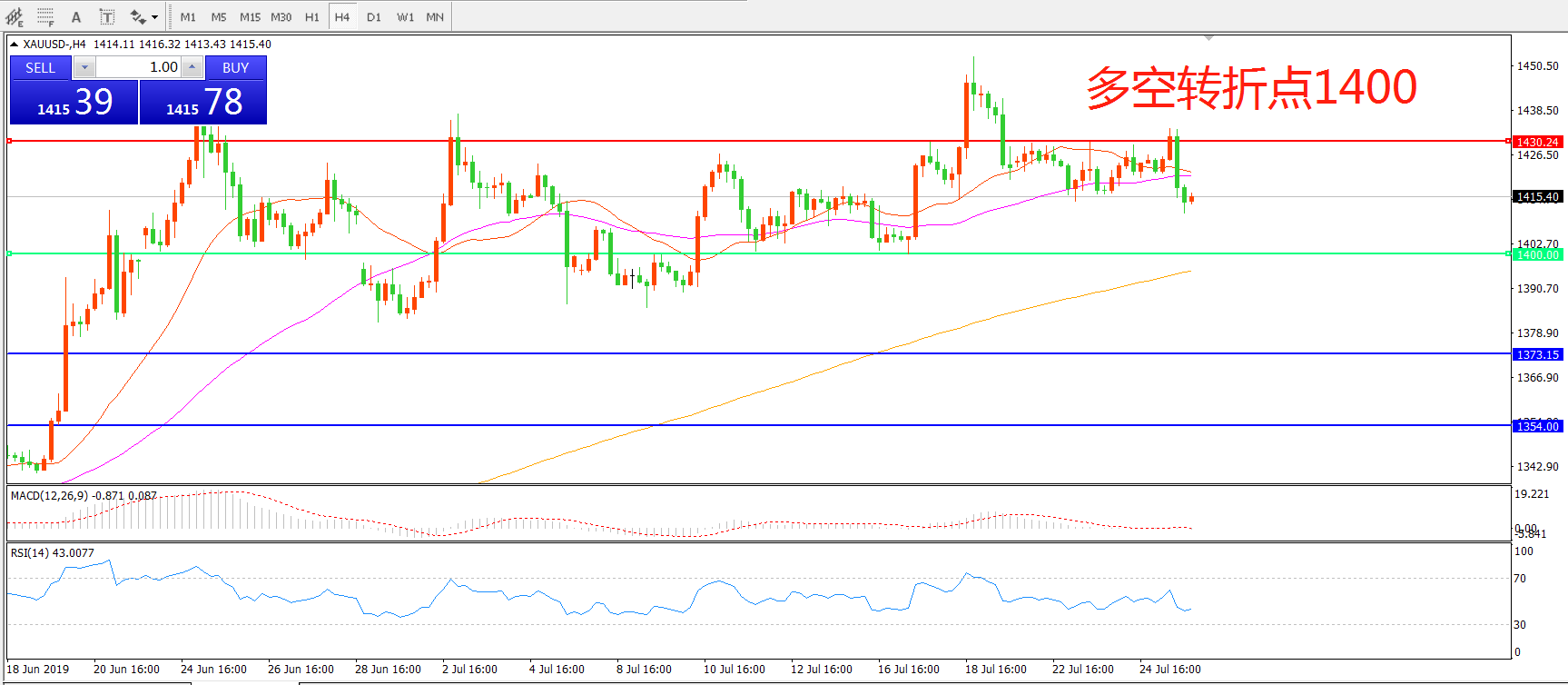 周四(7月24日)欧洲央行维持三大利率不变,但调整了前瞻指引,预计将保持现有关键利率水平不变或者更低水平至少至2020年上半年。但由于美国耐用品订单数据表现良好,美元大幅反弹,金价冲高回落,最终收报1415.71美元/盎司。市场目前注意力都集中在下周的美联储议息会议上,务必重点关注,目前日内行情交易较为清淡,部分投资者获利了结导致金价小幅下行,但不改变中期走势。
