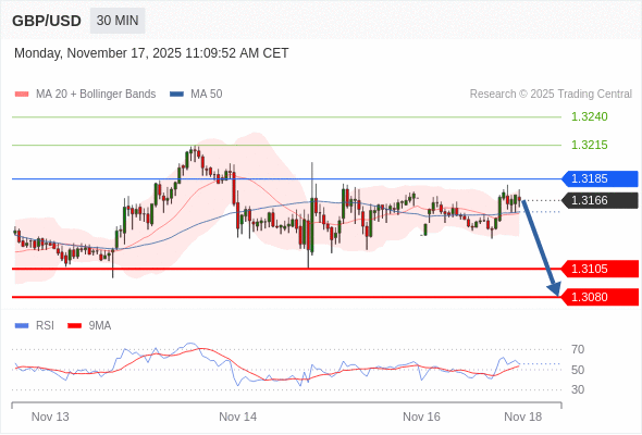 交易策略: 在 1.3185 之下,看跌,目标价位为 1.3105 ,然后为 1.3080 。