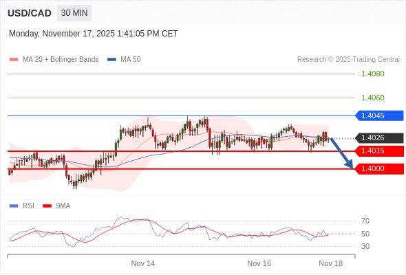 在 1.4045 之下,看跌,目标价位为 1.4015 ,然后为 1.4000 。