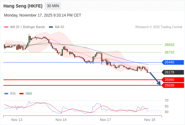 香港恒生指数期货 当日内: 存在压力。