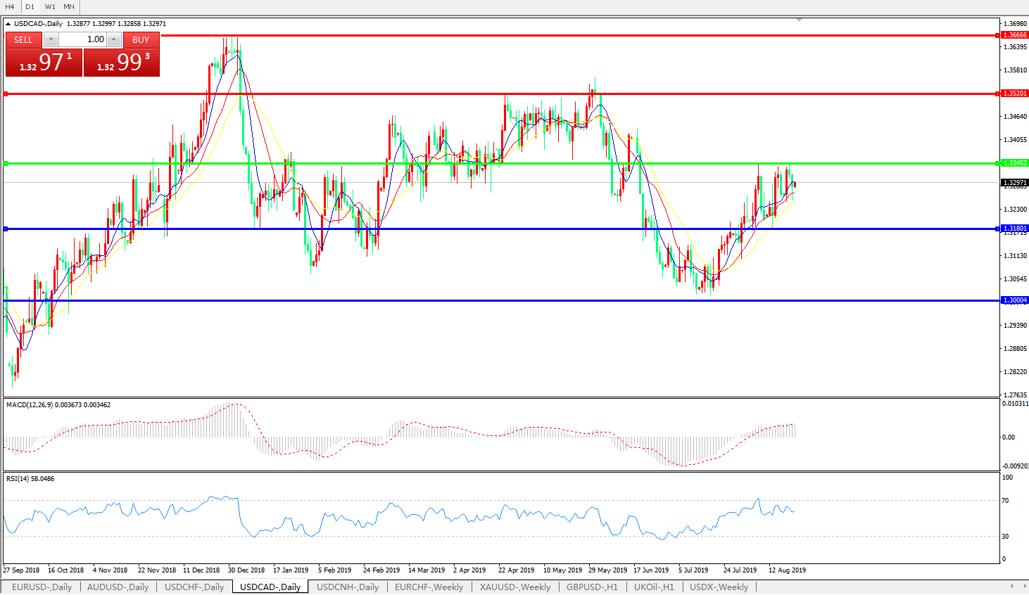 美元兑加元在周三日内承压走低,欧洲时段盘中失守1.33关口,一方面原因在于美元指数在美联储会议纪要即将出炉之际略现颓势,另一方面,油价的持续回升也使得加元走强;全球贸易环境前景自上周末以来略有好转,这使得市场对于未来原油需求增速放缓的顾虑也有所缓和,而这方面的顾虑曾在上周带动油价大跌。与此同时,中东地区局势仍不稳定,美国和伊朗官员本周以来仍在隔空互怼,这使得供给层面的忧虑也再度燃起。油价的持续上涨也令加元汇价在美元指数整体坚挺的本周依旧保持强健,美元兑加元数次上攻1.3345关键阻力位无果后,上升动能暂已耗尽。1.3345水平见顶,目前还不能过早下结论