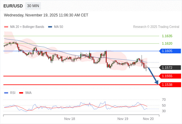 在 1.1605 之下,看跌,目标价位为 1.1565 ,然后为 1.1550 。