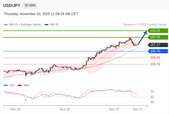 在 156.70 之上,看涨,目标价位为 157.75 ,然后为 158.25 。