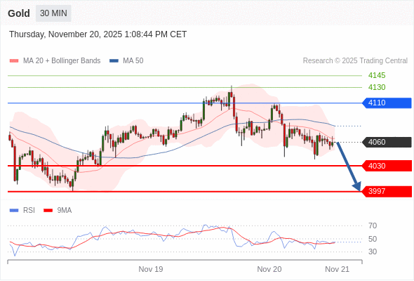 在 4110 之下,看跌,目标价位为 4030 ,然后为 3997 。