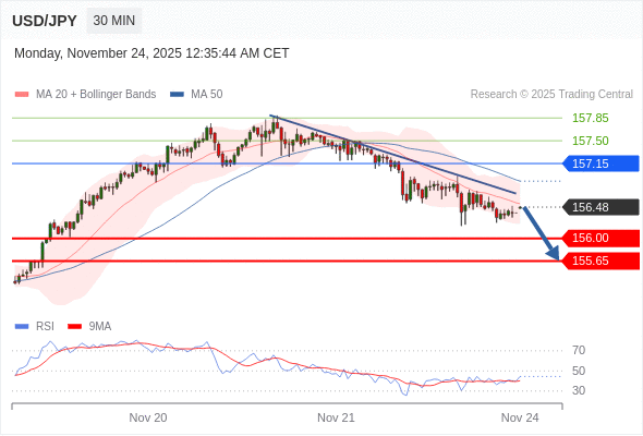 在 157.15 之下,看跌,目标价位为 156.00 ,然后为 155.65 。