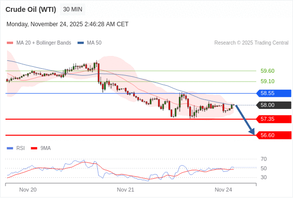 在 58.55 之下,看跌,目标价位为 57.35 ,然后为 56.60 。