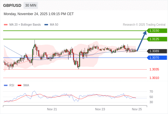 在 1.3070 之上,看涨,目标价位为 1.3125 ,然后为 1.3150 。