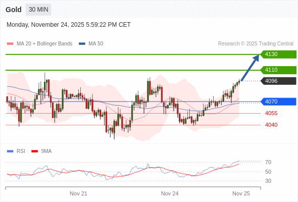 在 4070 之上,看涨,目标价位为 4110 ,然后为 4130 。