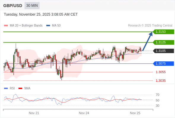 在 1.3075 之上,看涨,目标价位为 1.3125 ,然后为 1.3150 。
