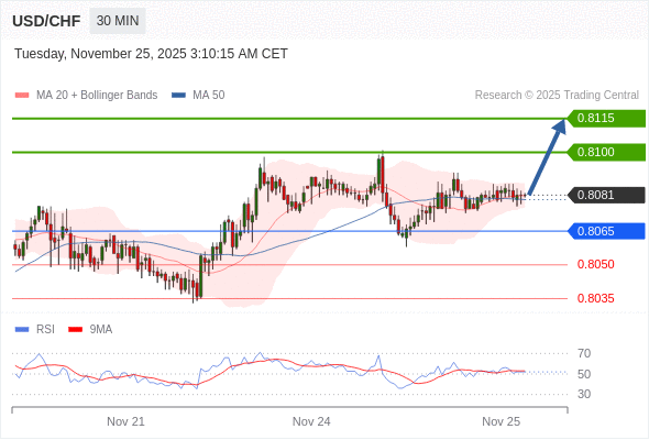 在 0.8065 之上,看涨,目标价位为 0.8100 ,然后为 0.8115 。