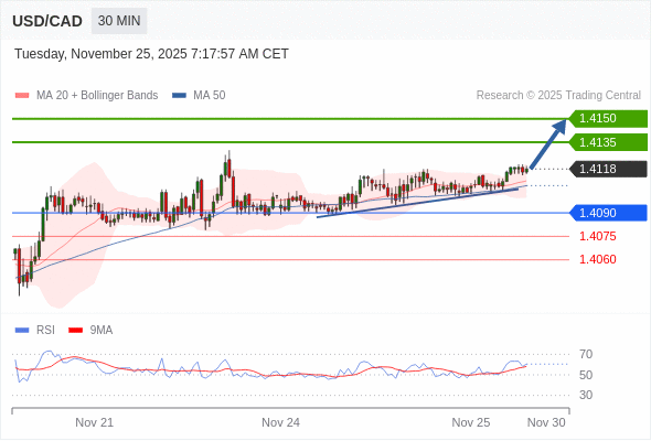 在 1.4090 之上,看涨,目标价位为 1.4135 ,然后为 1.4150 。