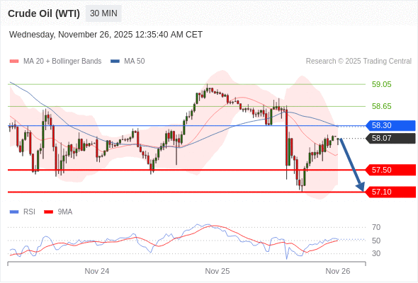 在 58.30 之下,看跌,目标价位为 57.50 ,然后为 57.10 。