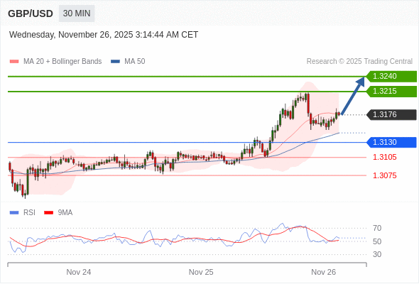 在 1.3130 之上,看涨,目标价位为 1.3215 ,然后为 1.3240 。