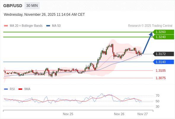 在 1.3140 之上,看涨,目标价位为 1.3240 ,然后为 1.3260 。