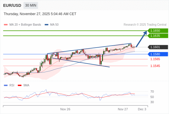 在 1.1580 之上,看涨,目标价位为 1.1635 ,然后为 1.1650 。