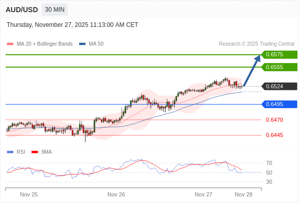 在 0.6495 之上,看涨,目标价位为 0.6555 ,然后为 0.6575 。