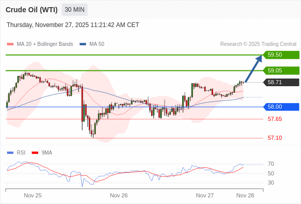 在 58.00 之上,看涨,目标价位为 59.05 ,然后为 59.50 。