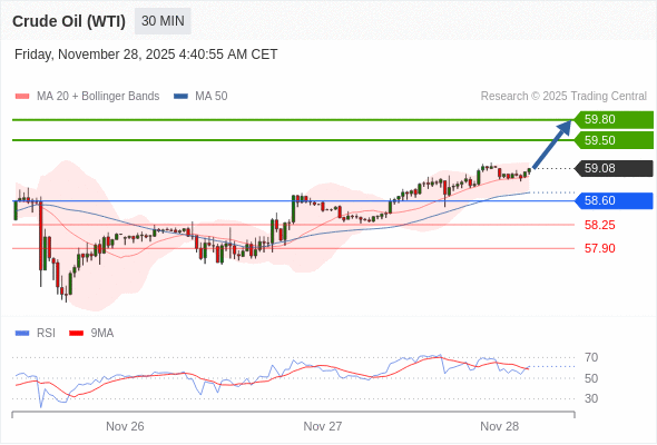 在 58.60 之上,看涨,目标价位为 59.50 ,然后为 59.80 。
