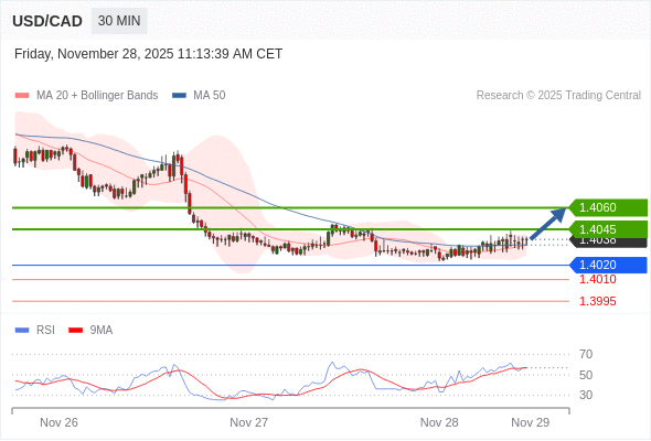 在 1.4020 之上,看涨,目标价位为 1.4045 ,然后为 1.4060 。