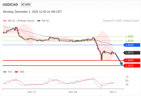 在 1.4010 之下,看跌,目标价位为 1.3935 ,然后为 1.3910 。