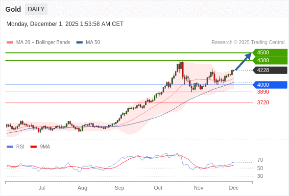 在 4000 之上,看涨,目标价位为 4380 ,然后为 4500 。