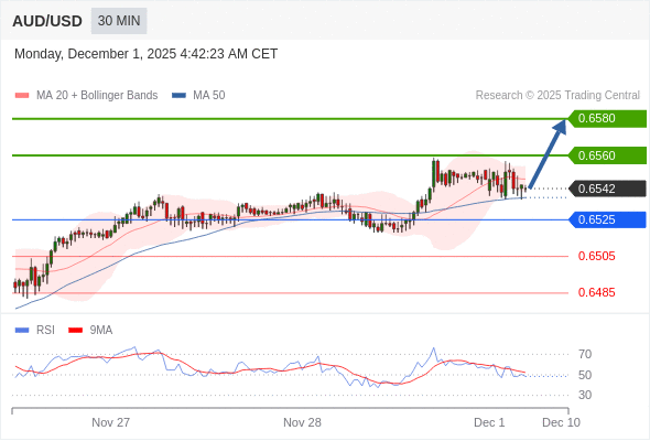在 0.6525 之上,看涨,目标价位为 0.6560 ,然后为 0.6580 。