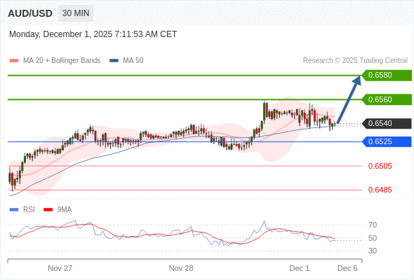 在 0.6525 之上,看涨,目标价位为 0.6560 ,然后为 0.6580 。