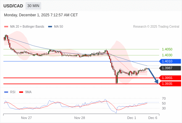 在 1.4010 之下,看跌,目标价位为 1.3955 ,然后为 1.3935 。
