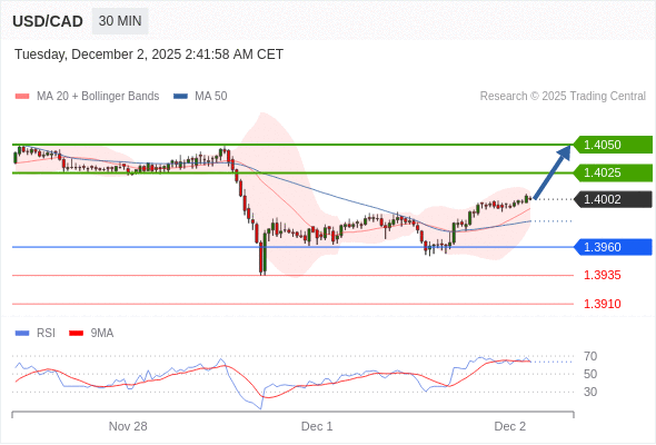 在 1.3960 之上,看涨,目标价位为 1.4025 ,然后为 1.4050 。