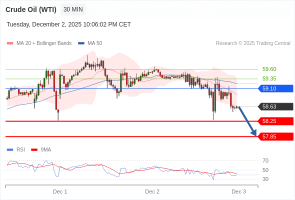 在 59.10 之下,看跌,目标价位为 58.25 ,然后为 57.85 。