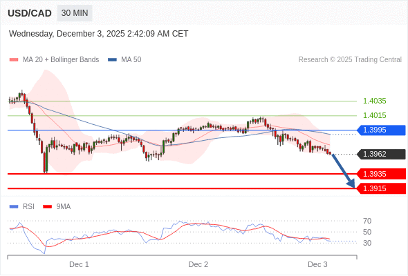 在 1.3995 之下,看跌,目标价位为 1.3935 ,然后为 1.3915 。