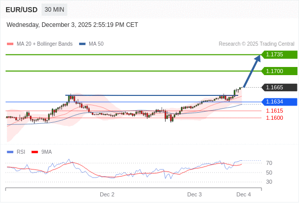 在 1.1634 之上,看涨,目标价位为 1.1700 ,然后为 1.1735 。