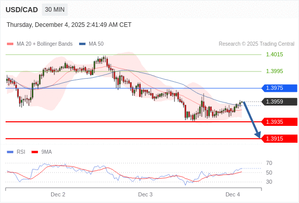 在 1.3975 之下,看跌,目标价位为 1.3935 ,然后为 1.3915 。