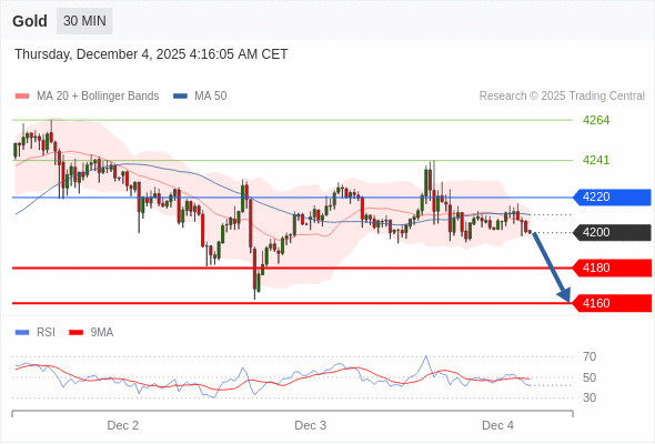 在 4220 之下,看跌,目标价位为 4180 ,然后为 4160 。