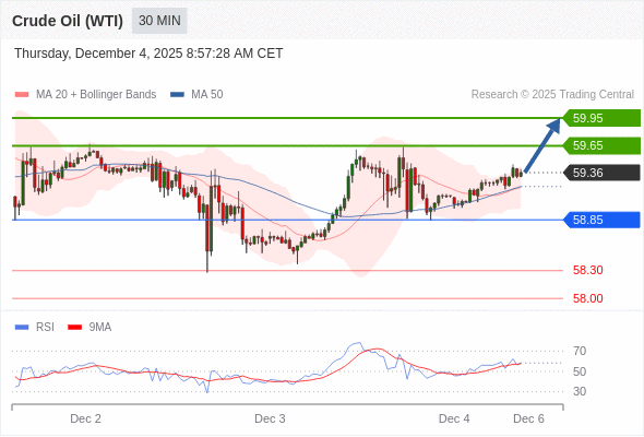 在 58.85 之上,看涨,目标价位为 59.65 ,然后为 59.95 。