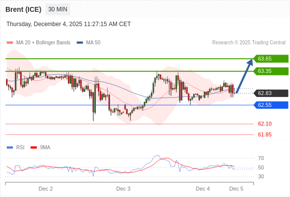 在 62.55 之上,看涨,目标价位为 63.35 ,然后为 63.65 。