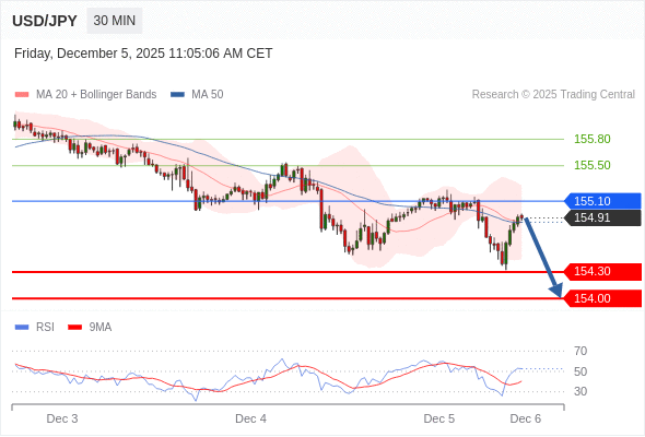 在 155.10 之下,看跌,目标价位为 154.30 ,然后为 154.00 。