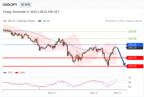 交易策略: 在 155.25 之下,看跌,目标价位为 154.70 ,然后为 154.35 。