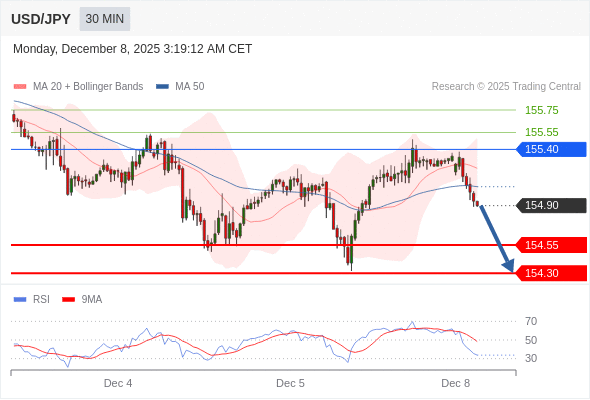在 155.40 之下,看跌,目标价位为 154.55 ,然后为 154.30 。