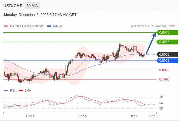 在 0.8025 之上,看涨,目标价位为 0.8055 ,然后为 0.8070 。