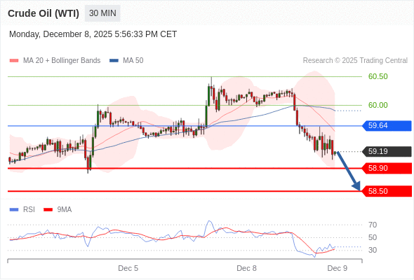 在 59.64 之下,看跌,目标价位为 58.90 ,然后为 58.50 。